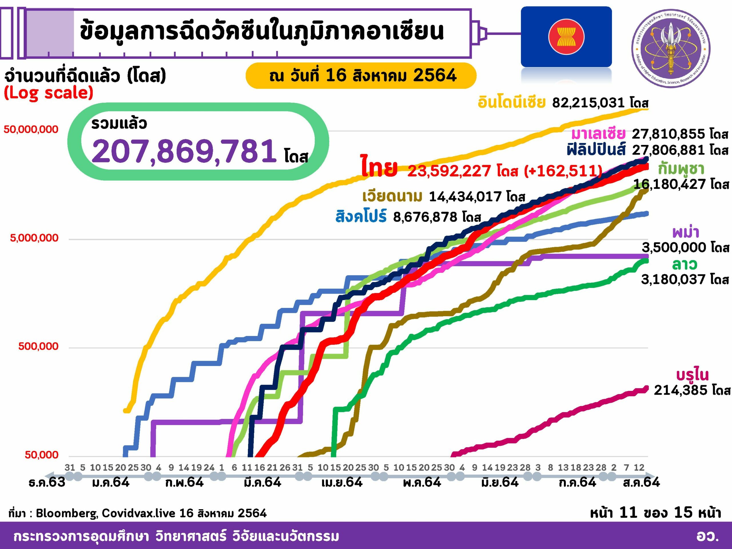 อว.เผยฉีดวัคซีนของไทย ณ วันที่ 16 สิงหาคม ฉีดวัคซีนแล้ว 23,592,227 โดส และทั่วโลกแล้ว 4,711 ล้านโดส ใน 203 ประเทศ/เขตปกครอง ส่วนอาเซียนฉีดแล้วทุกประเทศ รวมกันกว่า 207.86 ล้านโดส โดยจังหวัดของไทยที่ฉีดมากที่สุด คือ กรุงเทพฯ โดยฉีดวัคซีนเข็มแรกกว่า 77.5%