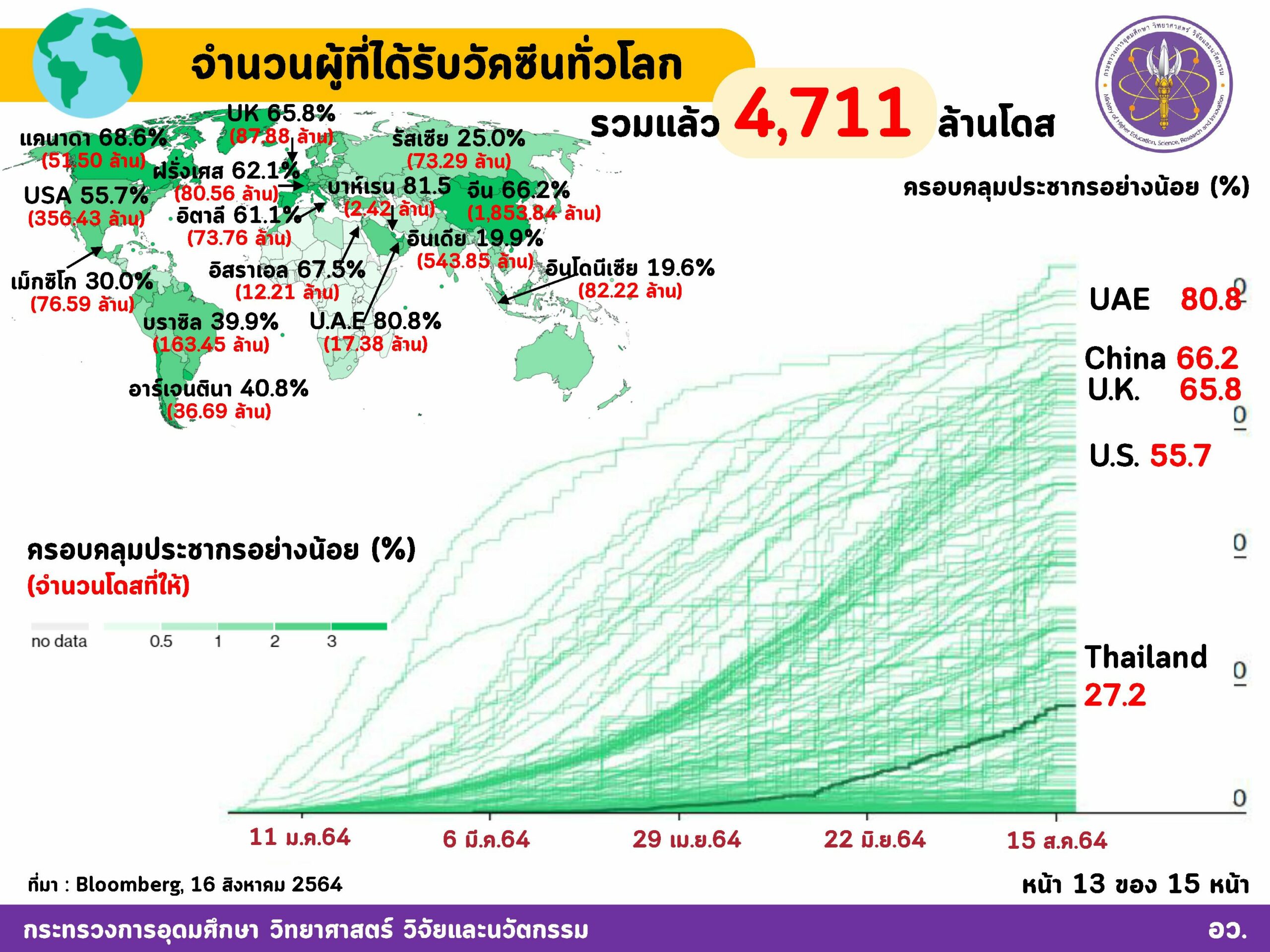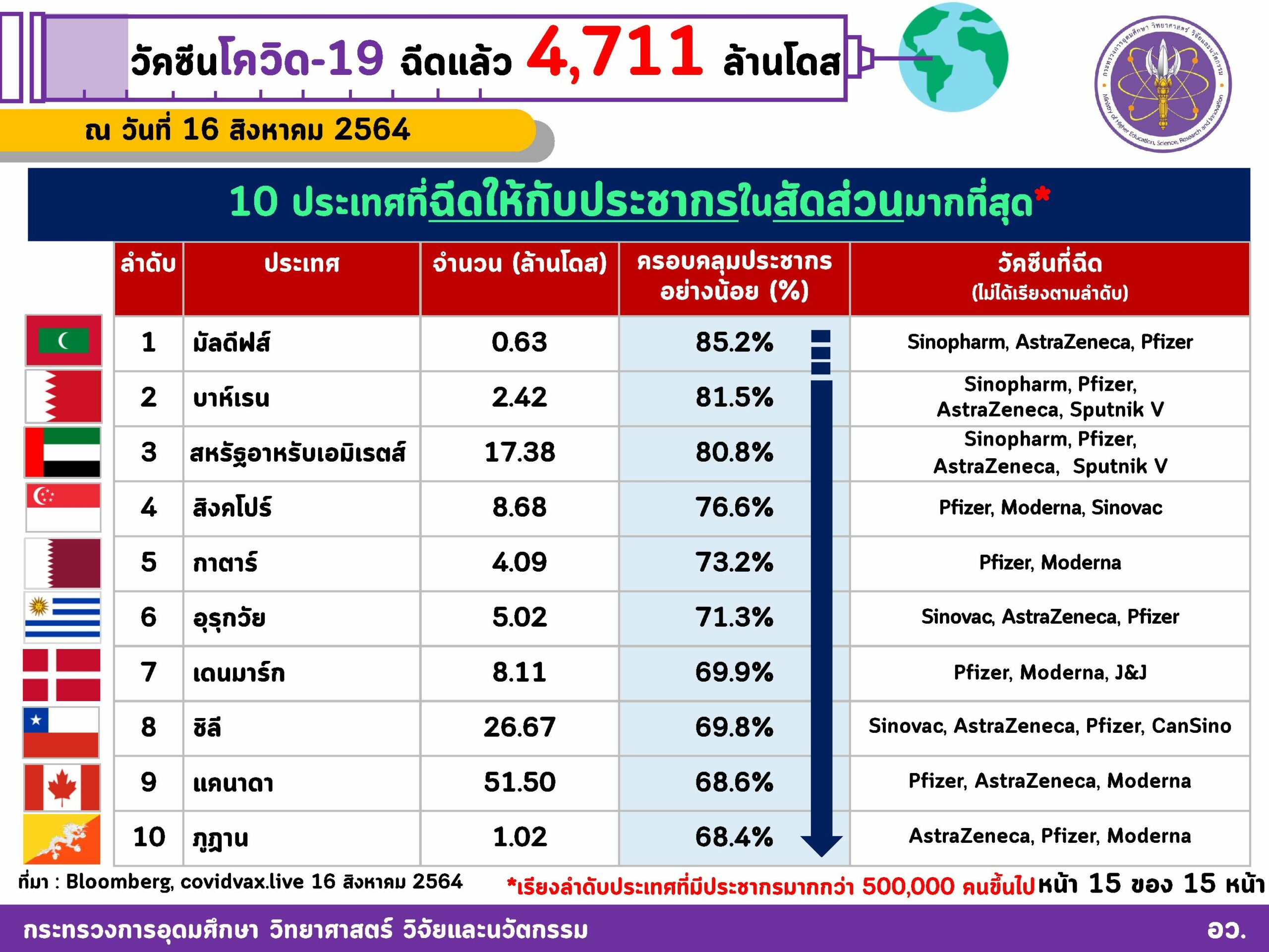 วันที่ 16 สิงหาคม 2564 กระทรวงการอุดมศึกษา วิทยาศาสตร์ วิจัยและนวัตกรรม (อว.) เผยข้อมูลสถิติการฉีดวัคซีนโควิด-19 ทั่วโลกแล้ว 4,711 ล้านโดส ใน 203 ประเทศ/เขตปกครอง โดยขณะนี้อัตราการฉีดล่าสุดรวมกันทั่วโลกที่ 38.2 ล้านโดสต่อวัน และมีแนวโน้มที่เพิ่มขึ้นอย่างต่อเนื่อง ในขณะที่สหรัฐอเมริกามีจำนวนการฉีดวัคซีนสูงที่สุดที่ 356 ล้านโดส โดยมีชาวอเมริกันกว่า 168 ล้านคนได้รับวัคซีนครบ 2 โดสแล้ว”