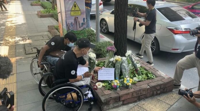 เครือข่ายเหยื่อเมาแล้วขับกรุงเทพฯพร้อมสมาชิกรวม 4 คน นำช่อดอกไม้ พร้อมป้ายข้อความไว้อาลัย หมอกระต่าย หลังทำกิจกรรมหวิดถูก จยย. ชนซ้ำจุดเดิม