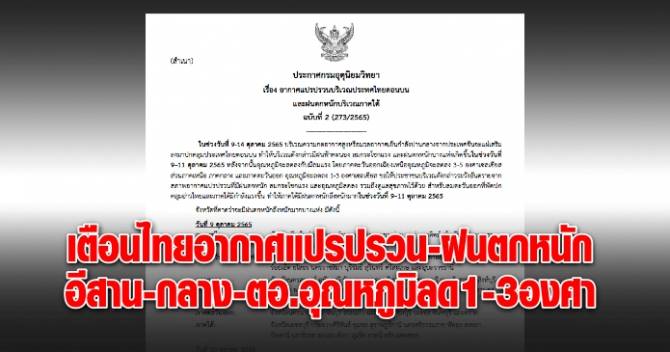 ประกาศกรมอุตุนิยมวิทยา”อากาศแปรปรวนบริเวณประทศไทยตอนบนและฝนตกหนักบริเวณภาคใต้” ฉบับที่ 2 ลงวันที่ 09 ตุลาคม 2565 ระบุว่า
