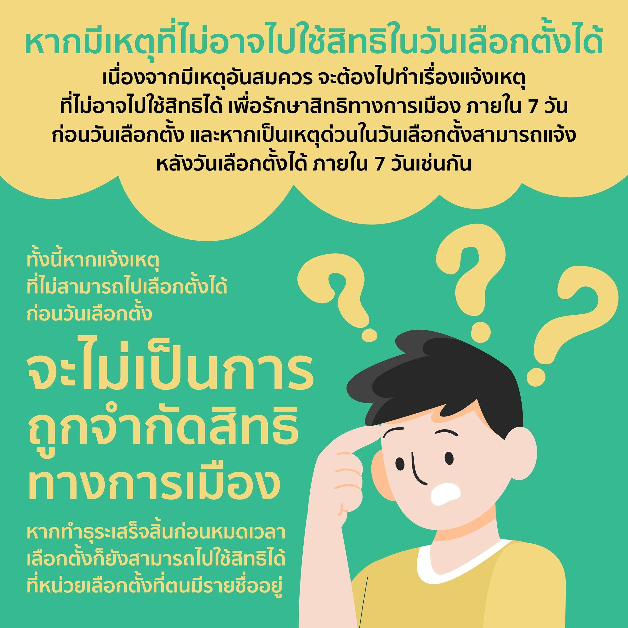 ทั้งนี้หากแจ้งเหตุที่ไม่สามารถไปเลือกตั้งได้ ก่อนวันเลือกตั้ง จะได้ไม่เป็นการถูกจำกัดสิทธิทางการเมือง หากทำธุระเสร็จสิ้นก่อนหมดเวลาเลือกตั้ง ก็ยังสามารถไปใช้สิทธิได้ที่หน่วยเลือกตั้งที่มีรายชื่ออยู่