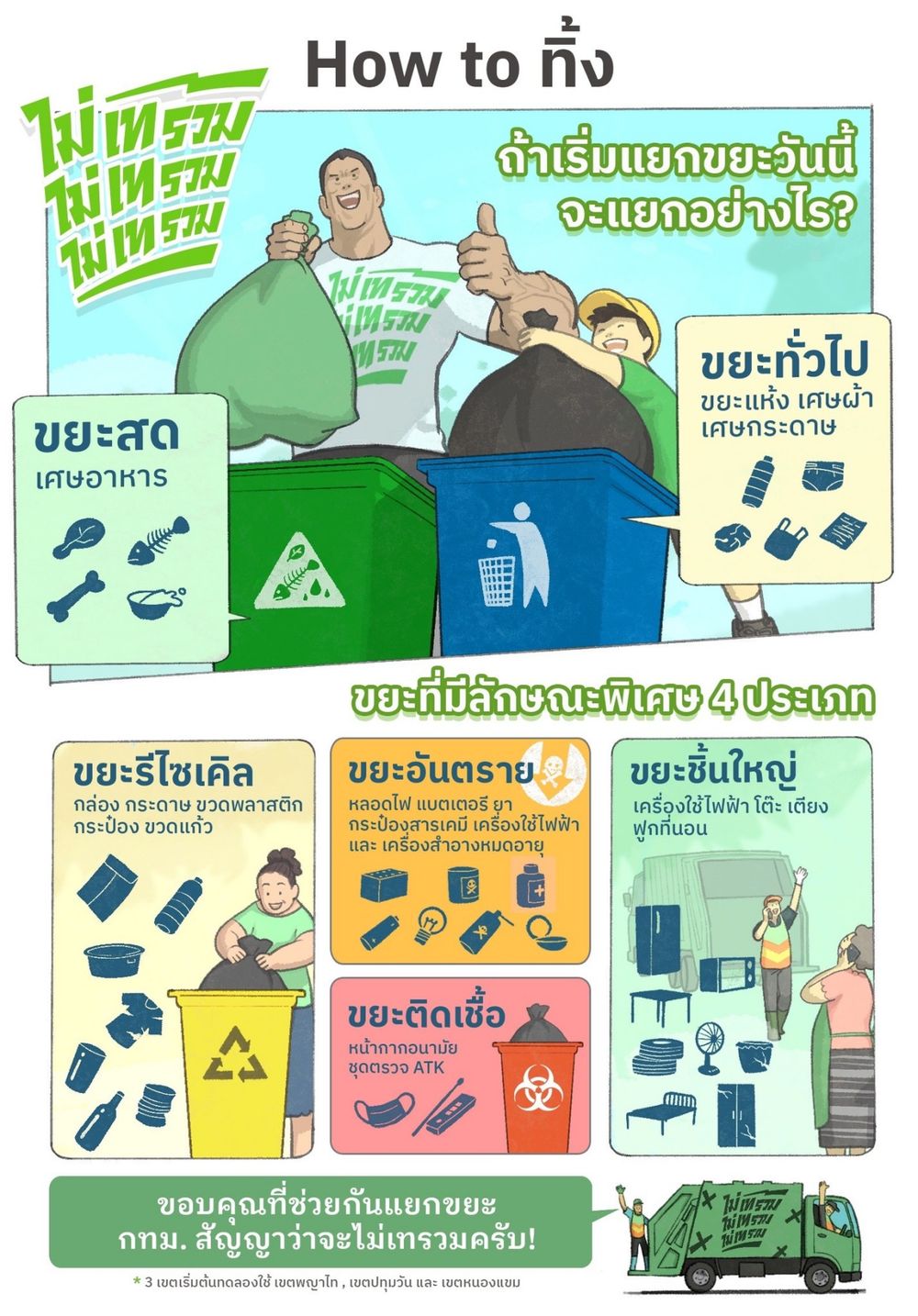 ทั้งนี้ ภาพรวมสถานการณ์พบว่า กทม. มีขยะกว่า 8,000 ตันต่อวัน เป็นขยะเศษอาหารมากกว่า 50% นโยบายไม่เทรวม จึงขอความร่วมมือประชาชนแยกขยะออกเป็น 2 ประเภทแบบง่าย ได้แก่ “ขยะเศษอาหาร” และ “ขยะทั่วไป” ออกจากกัน พร้อมทั้งบรรจุขยะทั้ง 2 ประเภทในถุงขยะที่แตกต่างกันเพื่อให้เห็นได้อย่างชัดเจนมากขึ้น อีกทั้งการแยกขยะทั้ง 2 ประเภทออกจากกันจะทำให้การบริจาคการจัดขยะเป็นไปได้อย่างมีประสิทธิภาพมากขึ้น สามารถส่งขยะไปรีไซเคิลทำปุ๋ยหมัก หรือส่งขยะไปทำเชื้อเพลิงแบบ RDF (Refuse Derived Fuel) ได้มากขึ้น ลดการฝังกลบขยะที่จะก่อให้เกิดปัญหาอีกมากมาย