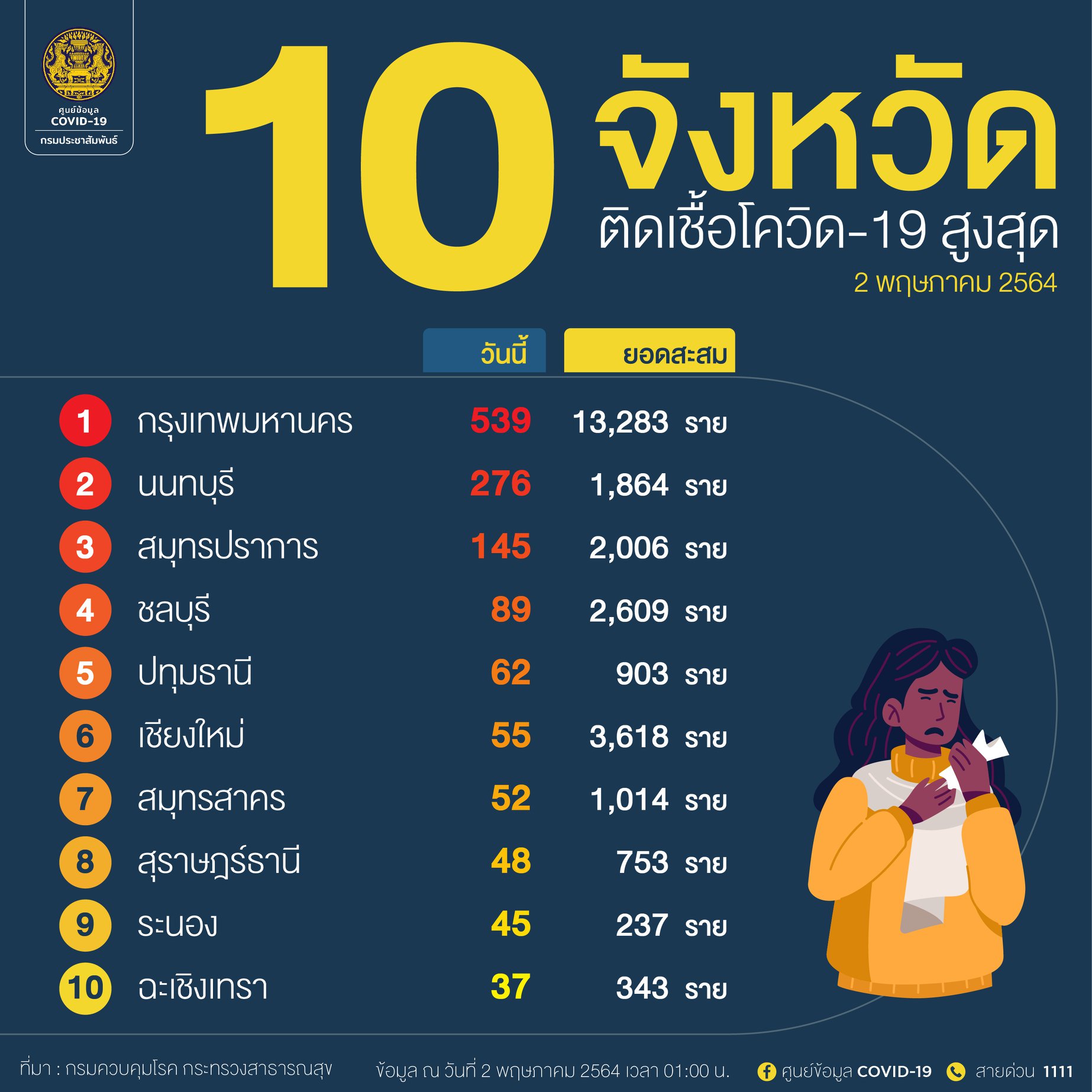 - กรุงเทพมหานคร รายใหม่ 539 ราย สะสม 13,283 ราย