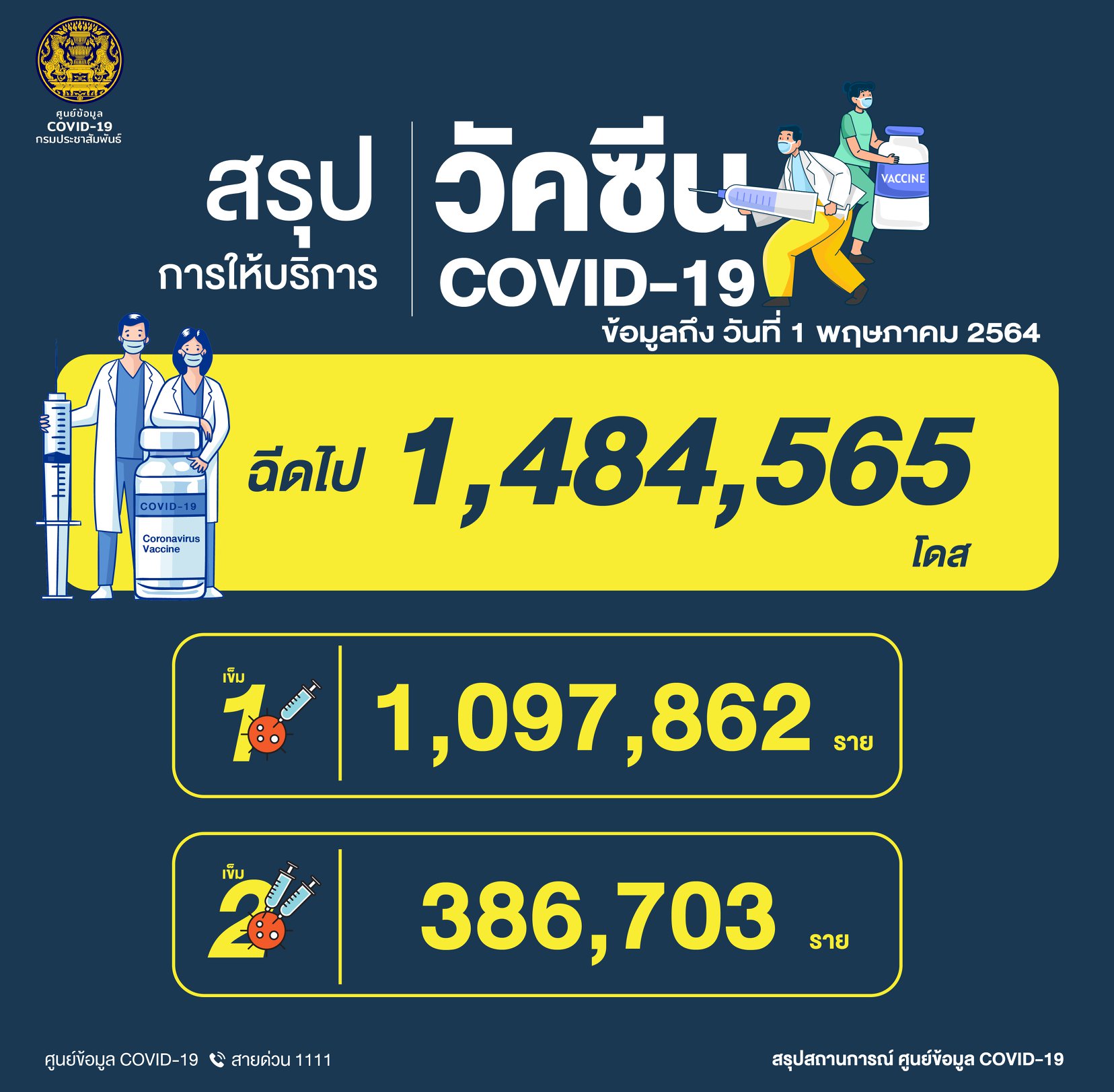 ระหว่างวันที่ 28 กุมภาพันธ์ – 1 พฤษภาคม 2564 มีผู้รับวัคซีน สะสมทั้งหมด จำนวน 1,484,565 โดส ส่วนวันที่ 1 พฤษภาคม 2564 มีผู้รับการฉีดวัคซีน เข็มที่ 1 จำนวน 2,632 ราย เข็มที่ 2 จำนวน 4,855 ราย