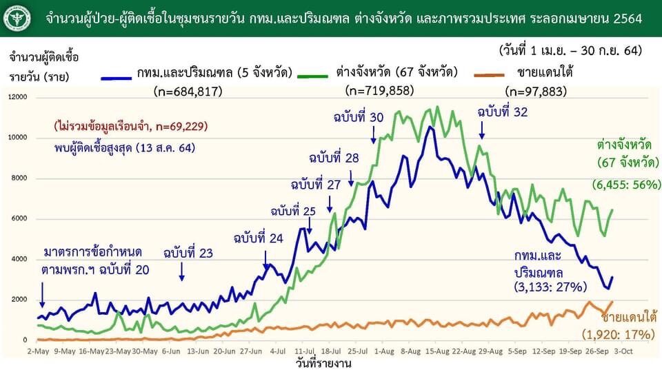 เมื่อดูภาพรวมการติดเชื้อใหม่ในประเทศ ในพื้นที่ต่างจังหวัด 67 จังหวัด มีผู้ติดเชื้อจำนวน 6,455 ราย คิดเป็น 56% กรุงเทพฯและปริมณฑล 3,133ราย คิดเป็น 27% ชายแดนใต้ 1,920 ราย คิดเป็น 17% โดยกรุงเทพฯเป็นจังหวัดเดียวมีติดเชื้อเกิน 1,000 ราย และไม่มีผู้ติดเชื้อ 2 จังหวัด คือน่านและพะเยา