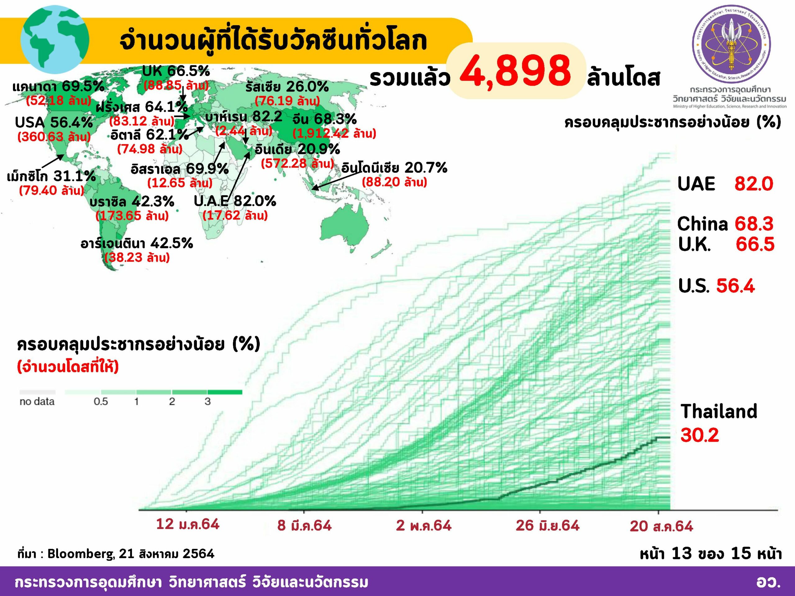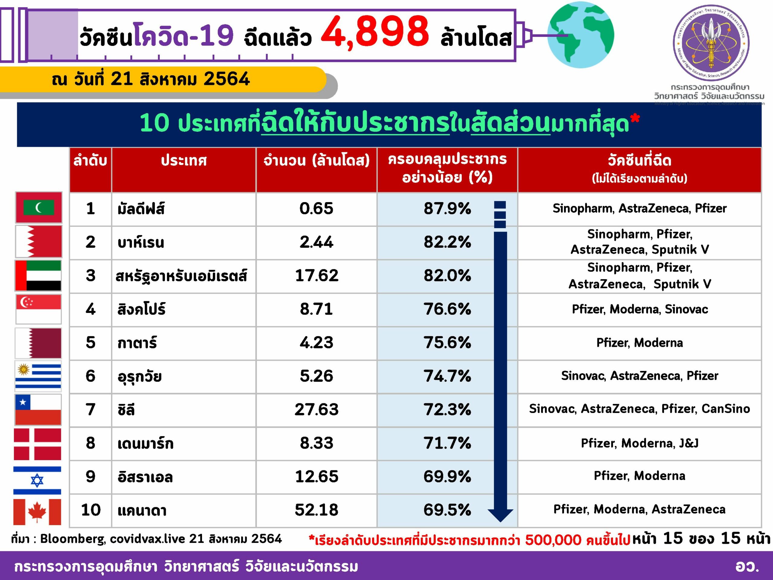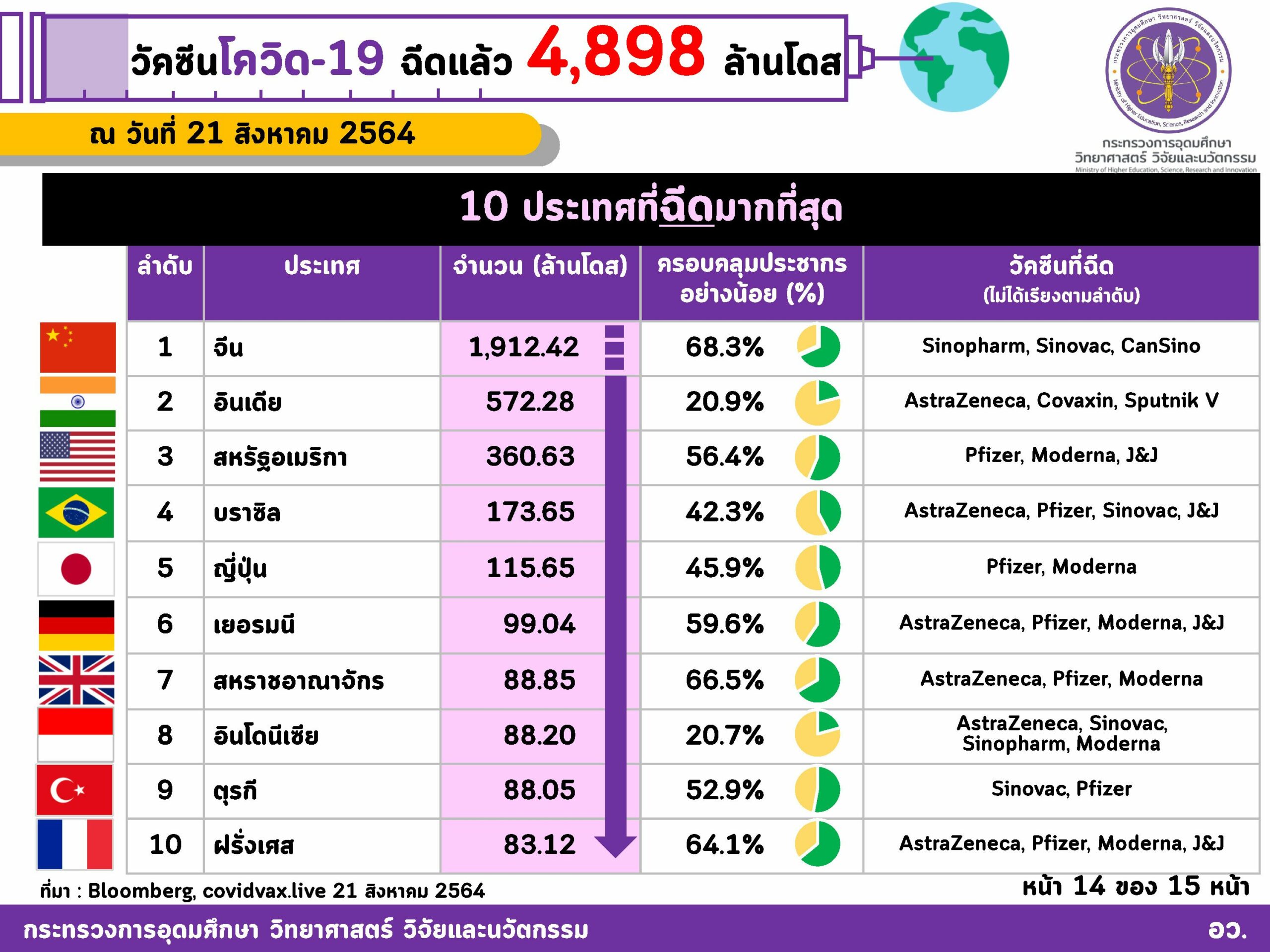 กระทรวงการอุดมศึกษา วิทยาศาสตร์ วิจัยและนวัตกรรม (อว.) เผยข้อมูลสถิติการฉีดวัคซีนโควิด-19 ทั่วโลกแล้ว 4,898 ล้านโดส ใน 203 ประเทศ/เขตปกครอง โดยขณะนี้อัตราการฉีดล่าสุดรวมกันทั่วโลกที่ 36.2 ล้านโดสต่อวัน และมีแนวโน้มที่เพิ่มขึ้นอย่างต่อเนื่อง ในขณะที่สหรัฐอเมริกามีจำนวนการฉีดวัคซีนสูงที่สุดที่ 361 ล้านโดส โดยมีชาวอเมริกันกว่า 170 ล้านคนได้รับวัคซีนครบ 2 โดสแล้ว”
