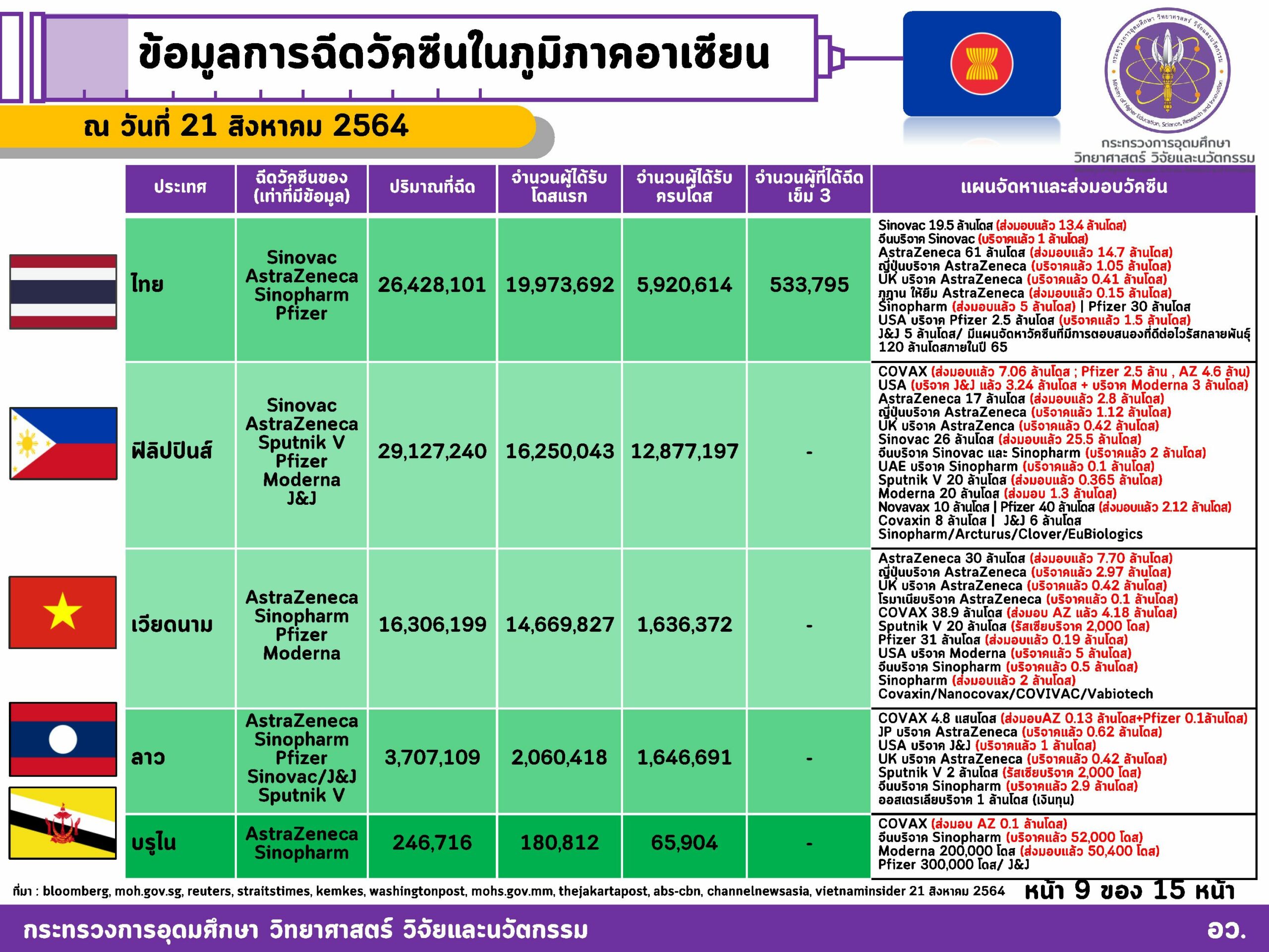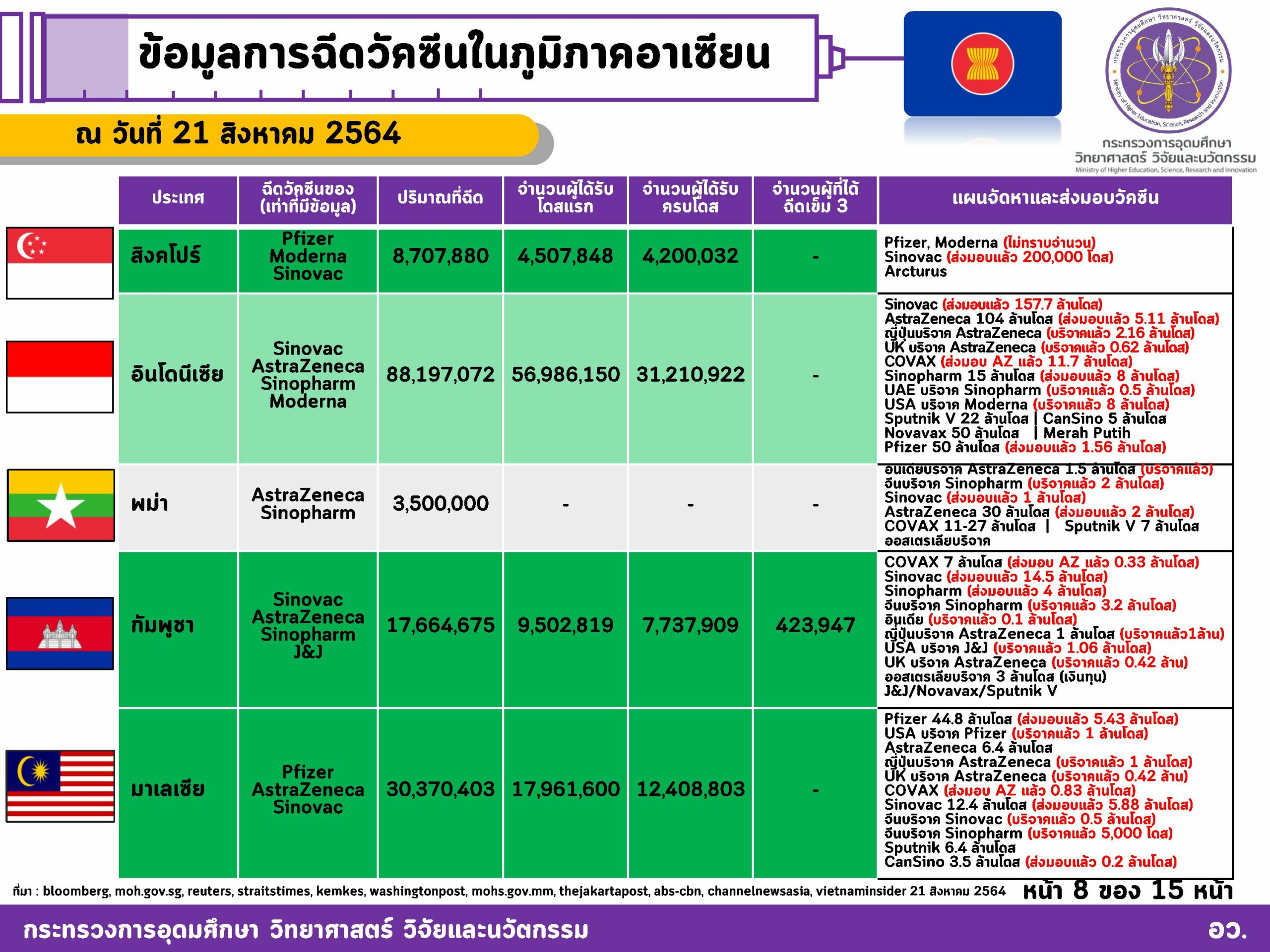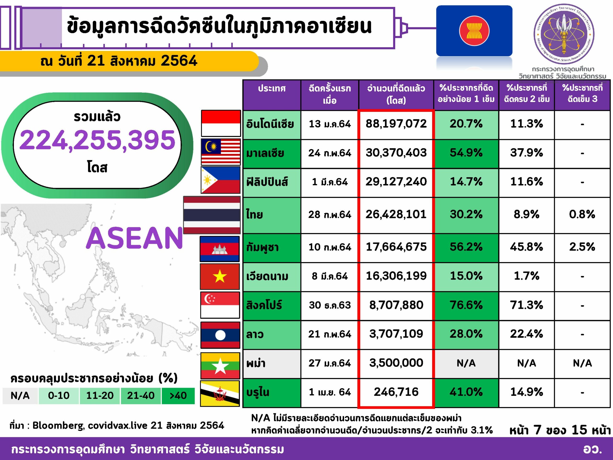 6. ในภูมิภาคอาเซียน ได้ฉีดวัคซีนแล้วครบ 10 ประเทศ รวมจำนวน 224,255,395 โดส ได้แก่