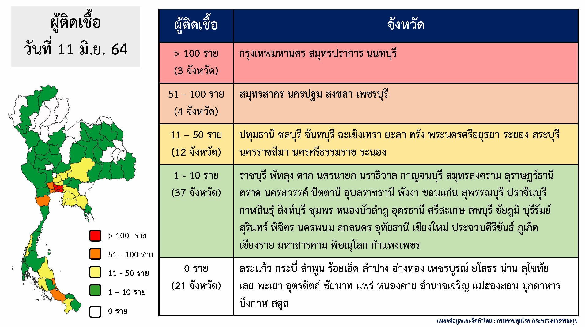 เมื่อวันที่ 11 มิถุนายน 2564 ศูนย์ข้อมูลโควิด-19 ได้เปิดเผย 10 จังหวัดที่ติดเชื้อโควิด-19 สูงที่สุด โดยในวันนี้จังหวัดที่ติดเชื้อโควิดสูงที่สุดยังคงเป็น 1.กรุงเทพมหานคร มีจำนวน 942 ราย ยอดสะสม 51,403 ราย รองลงมาคือ 2.สมุทรปราการ จำนวน 173 ราย สะสม 9,902 ราย 3.นนทบุรี 102 ราย สะสม 8,238 ราย ต่อมาคือ 4.สมุทรสาคร จำนวน 98 ราย สะสม 3,843 ราย 5.นครปฐม ติด 83 ราย สะสม 1,732 ราย 6.สงขลา 70 ราย สะสม 1,894 ราย 7.เพชรบุรี จำนวน 56 ราย สะสม 7,683 ราย 8.ปทุมธานี จำนวน 50 ราย สะสม 5,260 ราย 9.ชลบุรี ติดเชื้อ 47 ราย สะสม 5,245 ราย และ 10.จันทบุรี ติดเชื้อ 37 ราย สะสม 982 ราย