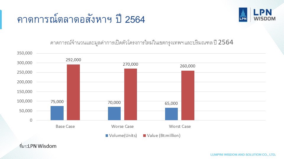 ภายใต้สมมติฐานดังกล่าว LWS คาดว่า ตลาดอสังหาริมทรัพย์ในปี 2564 จะมีแนวโน้มติดลบ -5% ถึง -6% เมื่อเทียบกับปี 2563 ซึ่งจะเป็นการติดลบต่อเนื่องเป็นปีที่สองจากปี 2563 ที่มีการเปิดตัวโครงการใหม่ติดลบ -37% เทียบกับปี 2562 โดยคาดว่าจะมีการเปิดตัวโครงการใหม่ในเขตกรุงเทพมหานครและปริมณฑล ในปี 2564 ประมาณ 65,000-66,000 หน่วย มูลค่าประมาณ 260,000-265,000 ล้านบาท