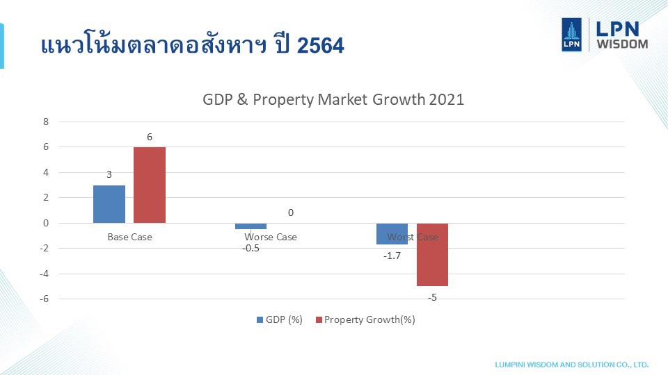 จากเดิมที่คาดว่าธุรกิจอสังหาริมทรัพย์ในเขตกรุงเทพมหานครและปริมณฑล ในปี 2564 จะมีแนวโน้มเติบโตได้ถึง 10% เมื่อเทียบกับปี 2563 ล่าสุดปรับใหม่เป็นแนวโน้มอัตราการเติบโตอยู่ที่ 5-6% ถึงติดลบ -5% ขึ้นอยู่กับความสามารถในการควบคุมสถานการณ์การแพร่ระบาดของ COVID-19 ในรอบนี้ที่มีการแพร่ระบาดเป็นวงกว้าง และส่งผลต่อการขับเคลื่อนเศรษฐกิจ